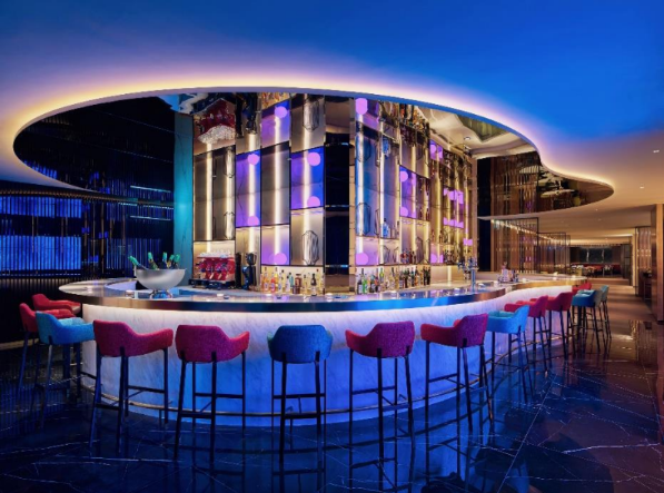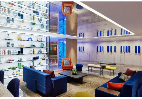 As you step into the intimate ground-level lobby, you'll be greeted by floor-to-ceiling windows that offer a tantalizing glimpse of neighboring luxury brands. The grey-colored marble flooring is enlivened by vivid pops of blue and orange, and the design incorporates color-changing light panels with abstract brush strokes and modern artwork, creating a stylish and welcoming atmosphere.